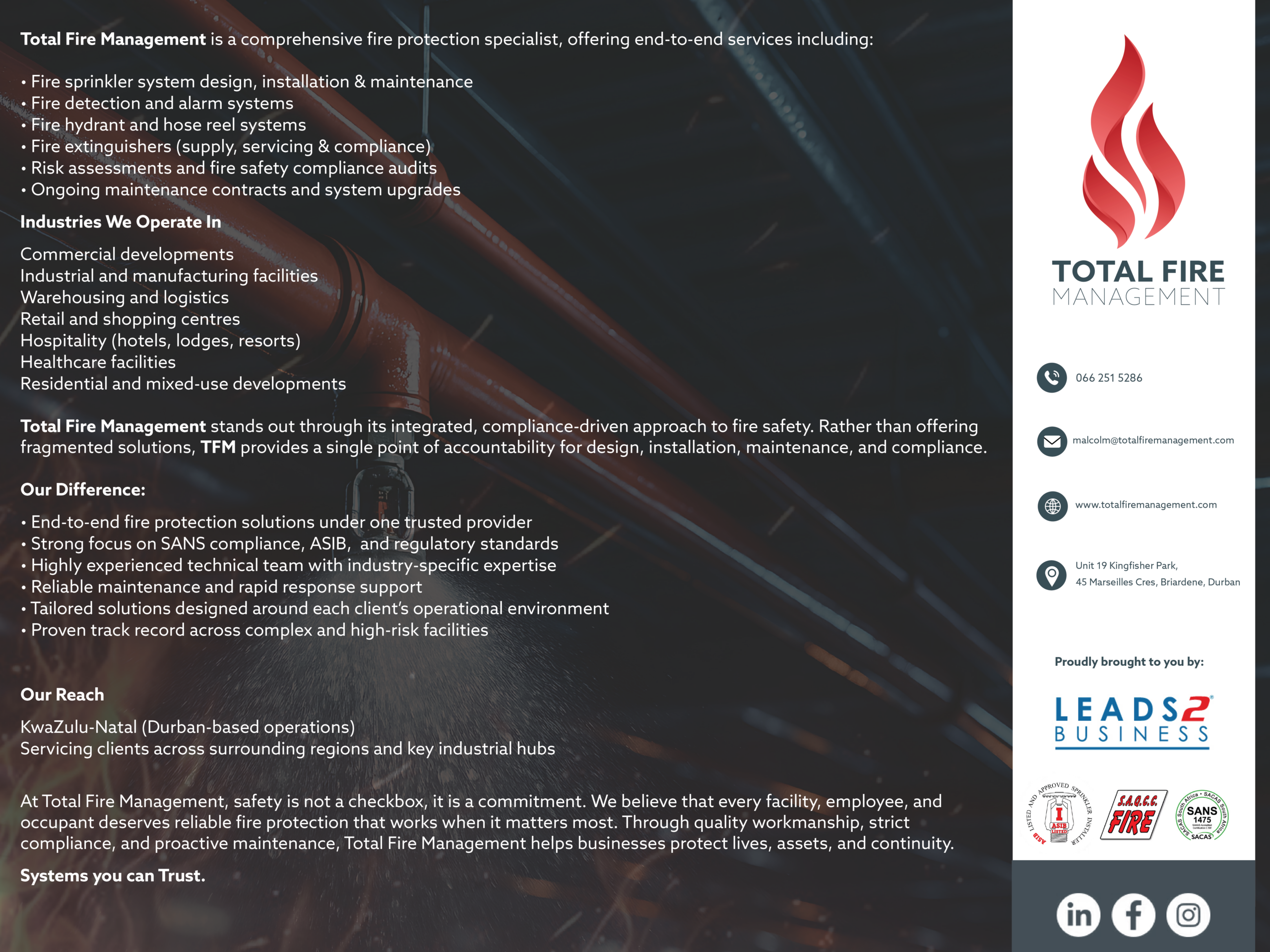 Read about Who’s Who in the Industry: We are dedicated to safeguarding lives and protecting properties through our comprehensive range of fire prevention.Our services encompass every aspect of fire safety, from conducting thorough fire risk assessments and developing customised fire safety plans to supplying and maintaining state-of-the-art fire detection and suppression systems.