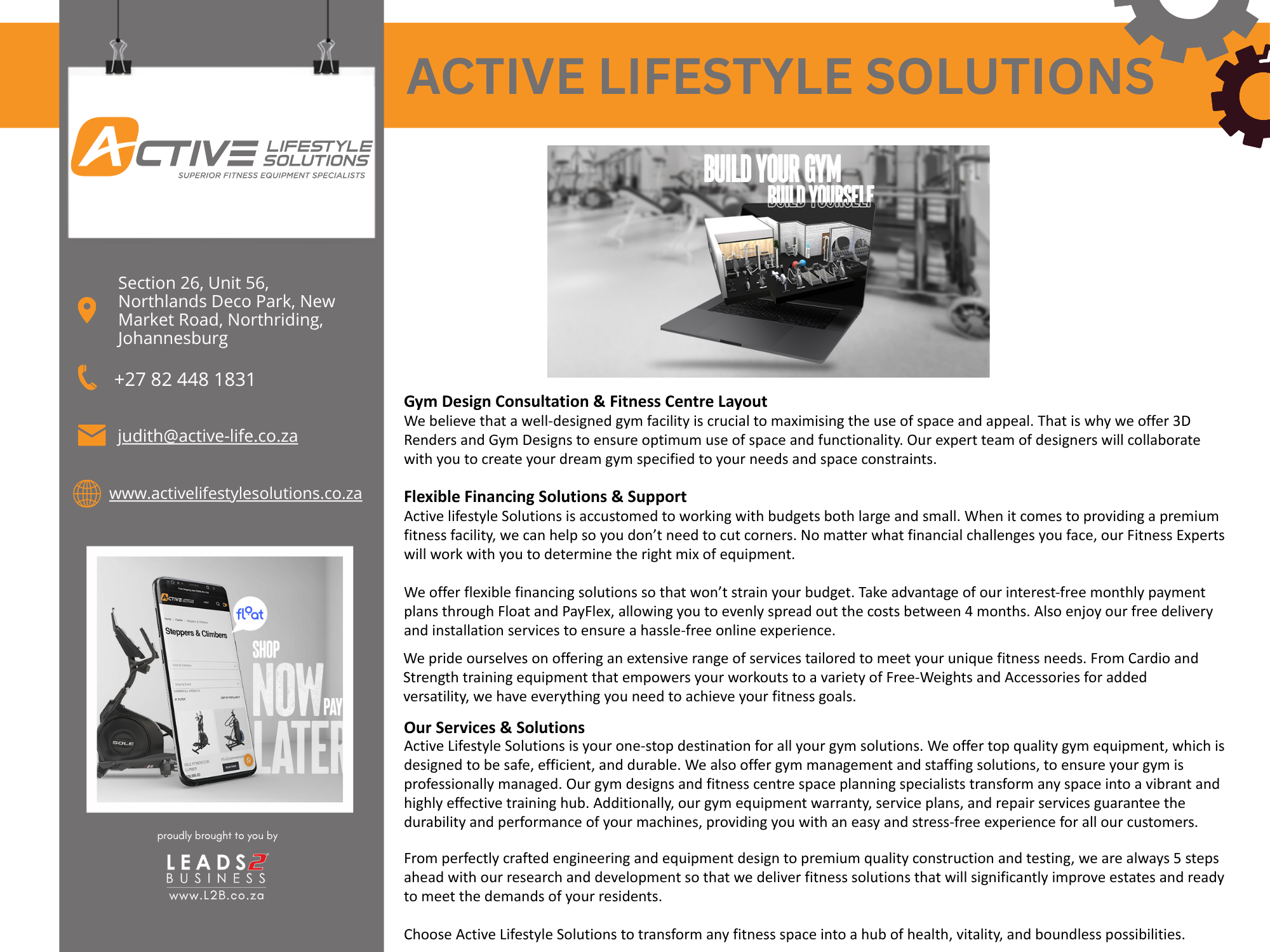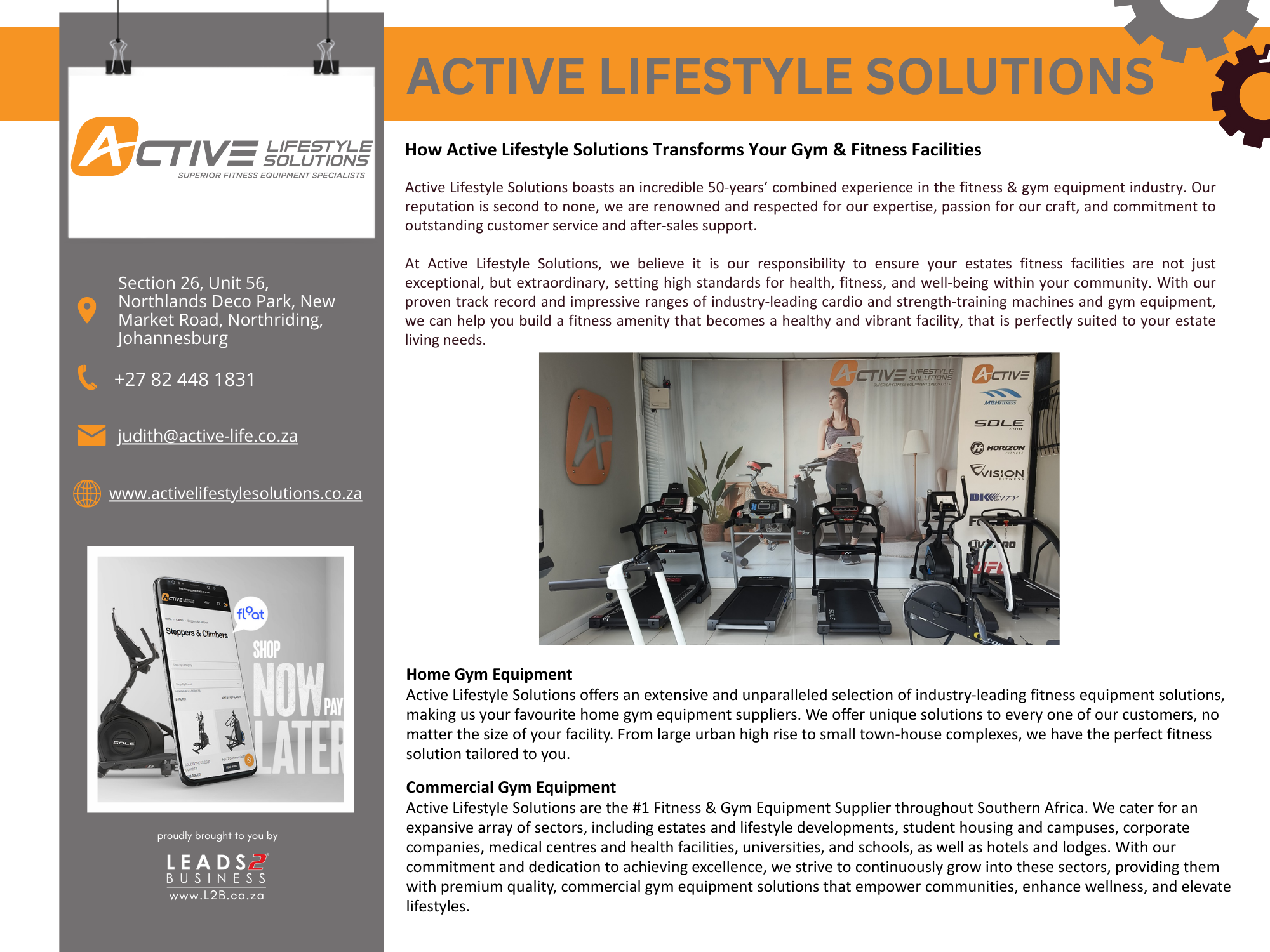 Read about Who’s Who in the Industry : Active Lifestyle Solutions is a leading independent distributor of strength and cardiovascular training equipment for the Southern African Commercial, Corporate and Residential Health and Wellness market. We have over 50-years’ combined experience in the fitness industry, and are well-known and respected for our expertise, passion for our craft, and commitment to outstanding customer service and after-sales support. Your Trusted Supplier of Home & Commercial Gym Equipment