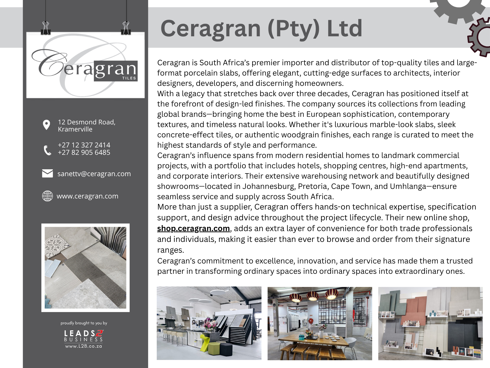 Read about Who’s Who in the Industry: Not only is Ceragran the supplier of choice for many of South Africa’s leading architects and contractors, but our exclusive range of designer products are available for home or small developments as well. Our showrooms in Johannesburg, Pretoria and Cape Town and our expert advice on selection, installation and maintenance are all designed to give you the professional result you are looking for, no matter the size of your project.