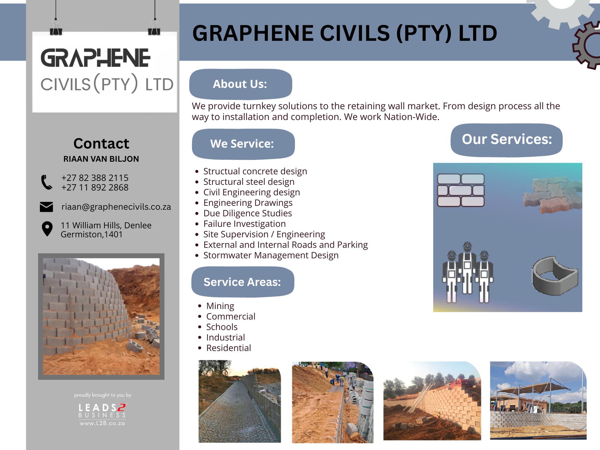 Read about Who’s Who in the Industry: We provide turnkey solutions to the retaining wall market. From design process all the way to installation and completion.